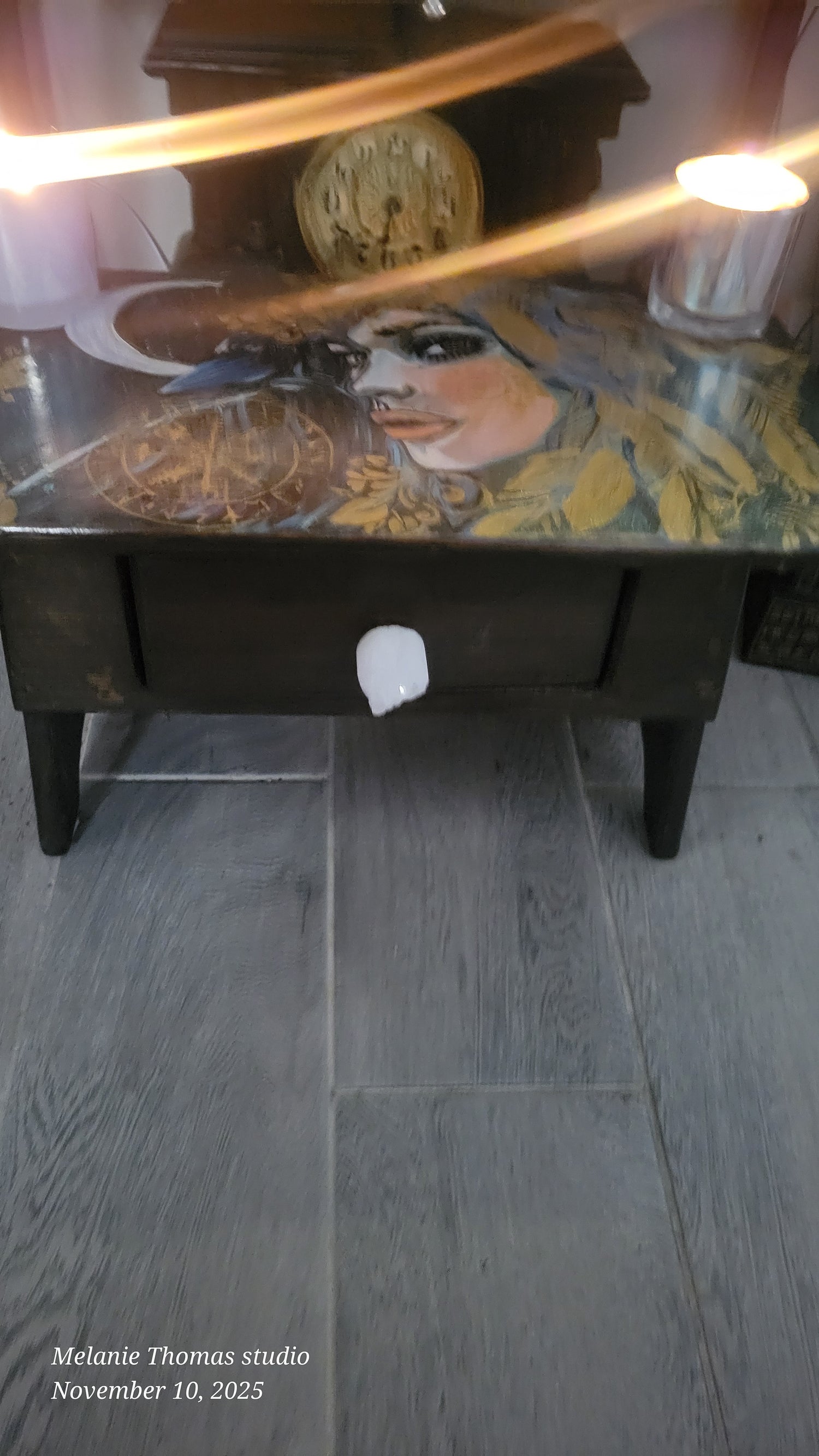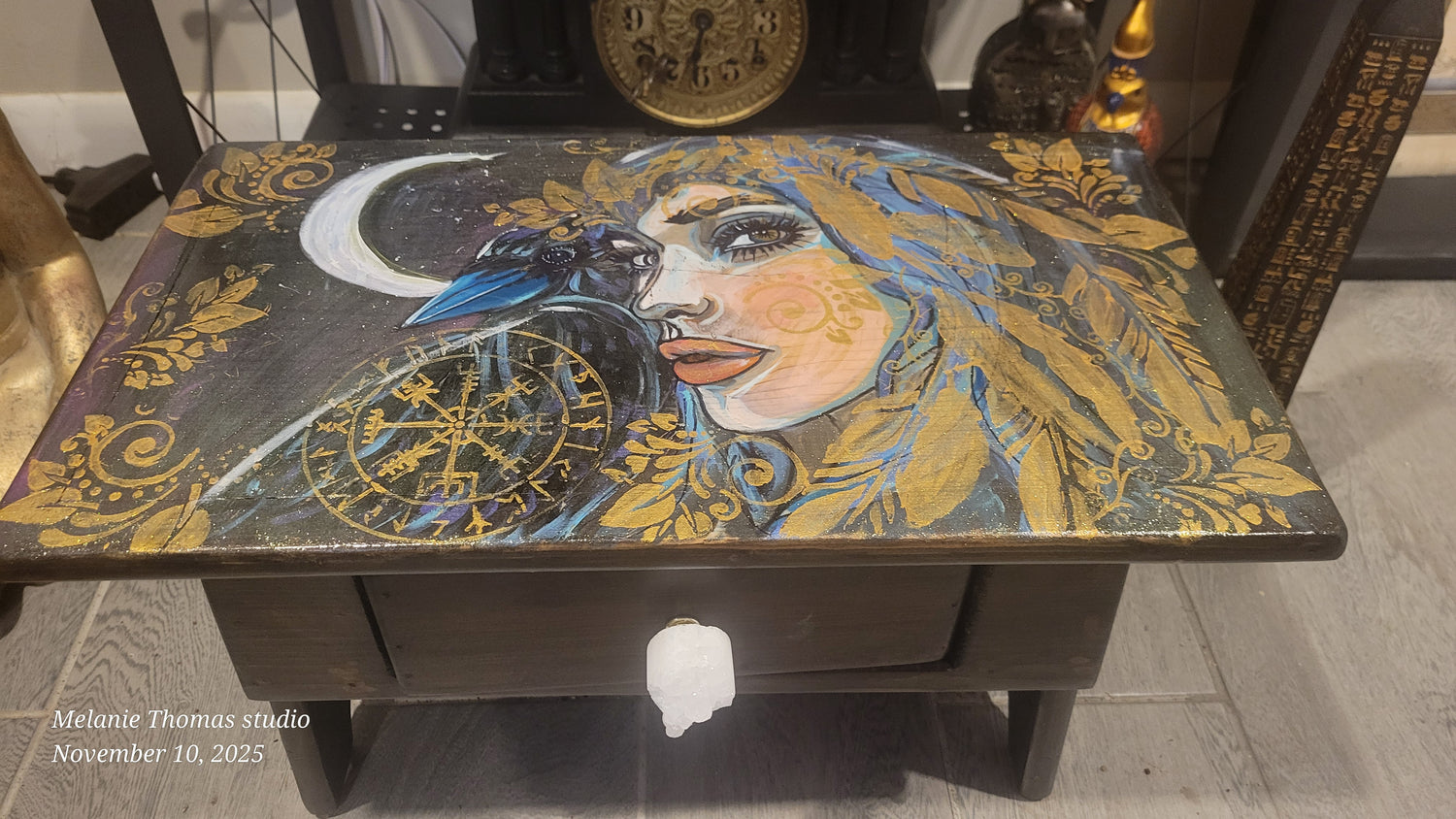 Each brushstroke was cast with intention and magic, sealed beneath a protective gloss to preserve her mystic glow. The altar features a large drawer for sacred storage, its handle crowned with a genuine quartz crystal knob, amplifying clarity, energy, and light. Perfect for spell tools, herbs, candles, or personal treasures of your craft.